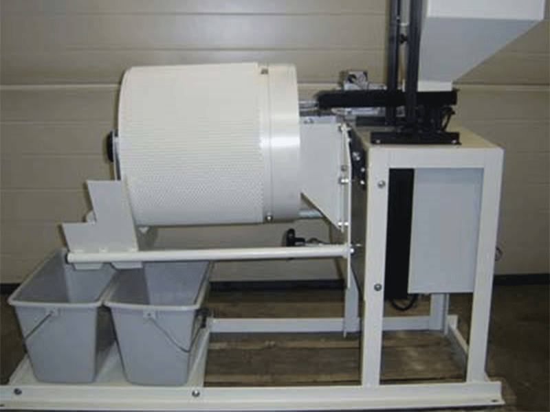 Intake hopper with adjustable vibrating feed. Quick change indented cylinder cover with a large range of sizes available. Easy and quick clean out. Vibrating device available on trough for difficult flowing products. Two collection containers. Continuous separating capacity up to 80kg per hour.